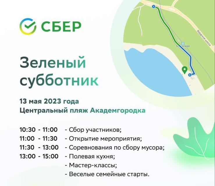На Центральном пляже Академгородка (ориентир – железнодорожная станция «Обское море») состоится «Зелёный субботник». Будут организованы соревнования по сбору мусора, мастер-классы по изготовлению скворечников и «весёлые старты». На протяжении экоакции будут выступать барды, участники субботника смогут принять участие в спортивных играх. Начало мероприятия в 11 часов.