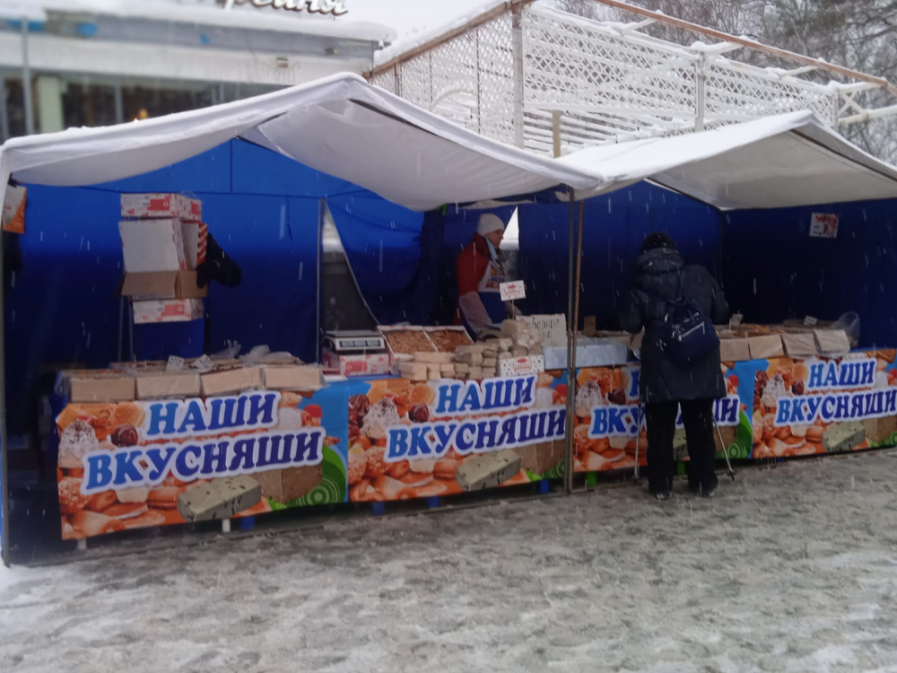 Семнадцать разноцветных торговых палаток сумели удовлетворить многие актуальные запросы декабря: дикоросы, мёд, мясо, домашний текстиль, сладости, рыбные деликатесы, растительные масла на любой вкус, разнообразные полуфабрикаты и букеты елового лапчатника по цене от 100 до 350 рублей.