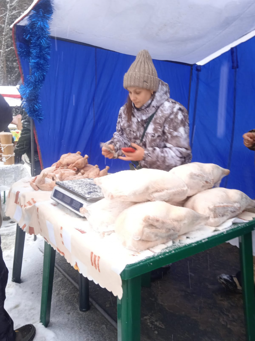 Главная царица декабрьских ярмарок – домашняя птица. Одинаково востребованы в это время целые тушки гусей, уток и бройлеров. Их выбор был велик: птица продавалась сразу в пяти местах.