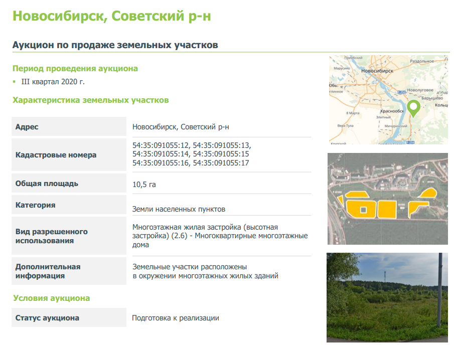 Торги должны были состояться в третьем квартале 2020 года. На участках победитель торгов мог построить высотки. Сейчас на большей части территории находится лес, рядом река.