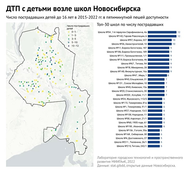 В Новосибирске исследователи определили 30 школ, рядом с которыми чаще всего дети становились участниками дорожно-транспортных происшествий. Больше всего таких ДТП зафиксировано около школ № 94 (1-й переулок Серафимовича, 4а) и № 142 (ул. Героев Революции, 6). Около них произошло по 12 происшествий с участием детей. Образовательное учреждение из Советского района средняя школа №190, расположенная на улице Иванова, 36, тоже в лидерах антирейтинга. Рядом с этим учебным заведением было 6 ДТП с участием школьников.