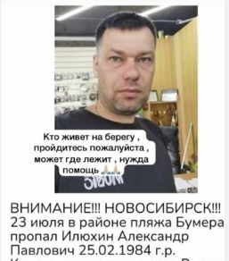 23 июля в районе пляжа «Бумеранг» пропал Илюхин Александр Павлович 1984 года рождения. Катался на гидроскутере. Возможно, кто-то подобрал и отвез его в больницу. За достоверную информацию – вознаграждение, – написали в соцсетях близкие пропавшего.