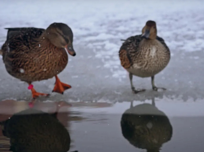 Птиц, застрявших в небольшой полынье, заметили прохожие. На озере Жемчужина Сибири плавали две утки – маленькая и покрупнее. Судя по всему, одна из них получила травму, а другая не захотела оставлять подружку. Поэтому на юг они не улетели.