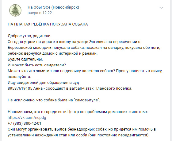 Днем 31 марта в группе «На ОбьГЭСе (Новосибирск)» появилось сообщение: в посёлке Плановом по дороге в школу на улице Энгельса девочку покусала собака.