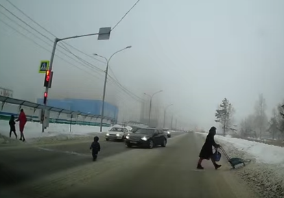 В социальных сетях появилось видео, как женщина переходила дорогу с ребёнком и санками. Она активно переносит санки с дороги на тротуар, не обратив внимания, что малыш остался стоять на проезжей части и его чуть не сбила машина. Произошло это в Калининском районе.