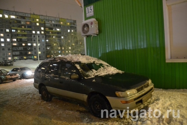 Снег, упавший с крыши магазина, проломил Toyota Corolla в Бердске