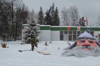 – Ребят, у вас скульптор всё это вырезает? – спрашивает мужчина, рассматривая и фотографируя большую снежную голову Черномора.