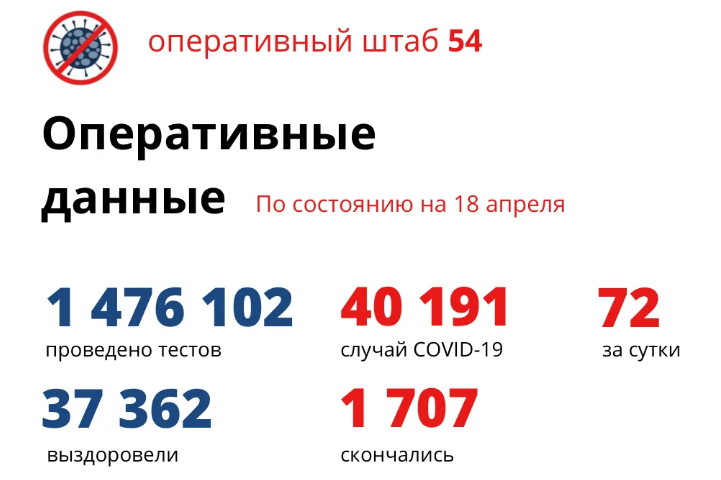 72 случая заражения выявили на утро 18 апреля. Выздоровели за сутки 19 пациентов. В регионе с марта прошлого года зарегистрирован 40191 случай коронавируса, 37362 новосибирца победили коварную болезнь.