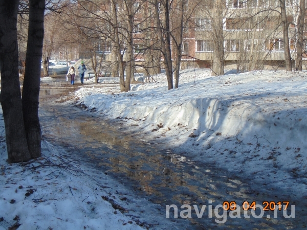 Ранняя весна – время, когда район предстает перед глазами не в самом лучшем ракурсе. После обеда 9 апреля, при температуре около +10, активно таял снег, по дорогам текли ручьи. По обочинам дорог почти везде еще лежит снег, черный от пыли и песка, которым зимой щедро посыпали проезжую часть. Тротуары, ради которых мы и отправились осматривать территорию, где-то уже просохли, а где-то остаются средоточием грязных луж.