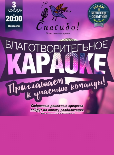 - Благотворительный фонд «Спасибо!» уже сегодня, 3 ноября, проводит соревнования по караоке в баре «Барабас» (ул. Мусы Джалиля, 14/1) в Академгородке.