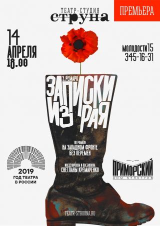 14 апреля  в Доме культуры «Приморский» состоится премьера «Записки из Рая» по роману Э. Ремарка «На Западном фронте без перемен». О вчерашних мальчишках, поддавшихся на патриотические призывы и попавших в мясорубку первой мировой войны. О том, что любая война жестока и абсурдна.