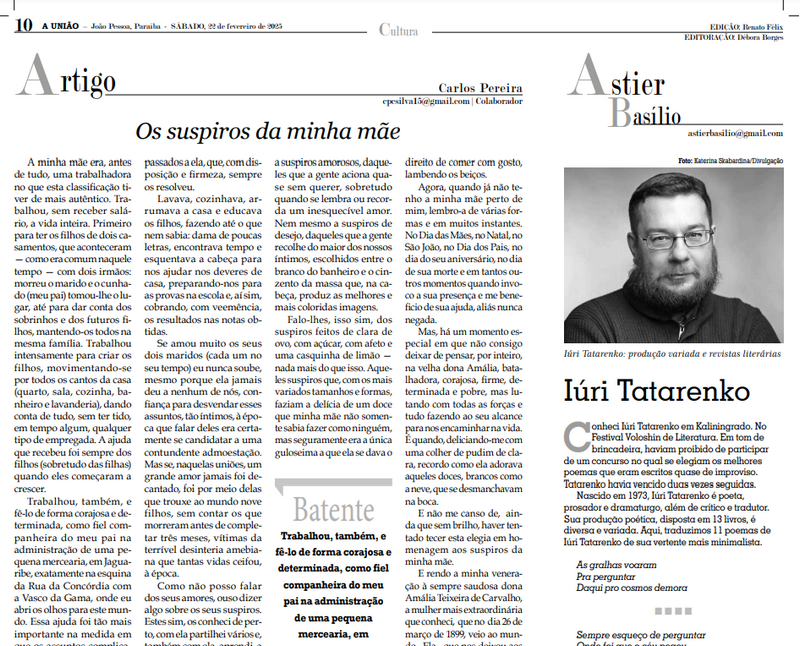 Поэту, журналисту, постоянному автору газеты «Навигатор» Юрию Татаренко недавно пришла интересная новость из Бразилии: верлибры новосибирца переведены на португальский язык и опубликованы в газете «A Uniao» («Единство»).