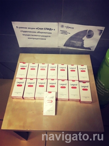 По словам студентов, в общежитии № 4 вчера на вахте лежали презервативы марок Contex и Legard, но упаковки контрацептивов были помятые и со стершимся сроком годности. В общежитиях № 10, 8/1 и 8/2 студенты обнаружили презервативы размером XXL и ребристые с точечками, однако их срок годности истекает в октябре этого года. Рядом с презервативами были листовки, где сообщалось об акции против распространения СПИДа.