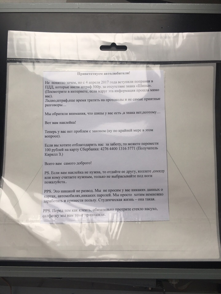 В прикрепленной вместе со знаком записке написано: «Не понятно зачем, но с 4 апреля 2017 года вступили в силу поправки в ПДД, которые ввели штраф 500 рублей за отсутствие знака «Шипы». Ладно штраф, еще время тратить на протоколы и не самые приятные разговоры... Мы обратили внимание, что шипы у вас есть, а знака нет, поэтому... Вот вам наклейка! Теперь у вас нет проблем с законом (по крайне мере в этом вопросе). Если вы хотите отблагодарить нас за заботу, то можете перевести 100 рублей на карту Сбербанка. Всего вам самого доброго! Если вам наклейка не нужна, то отдайте ее другу, коллеге, соседу, или кому считаете нужным, только не выбрасывайте под ноги, пожалуйста. Это никакой не развод. Мы просто хотим немножко заработать и принести пользу. Студенческая жизнь – она такая».