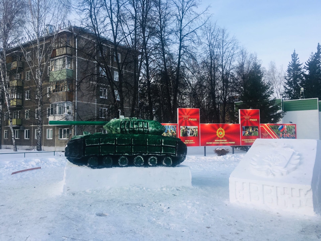 Улицу Иванова вновь украсили снежные фигуры, сделанные руками курсантов Новосибирского высшего военного командного училища. Здесь и сказочные персонажи, и символика военного училища, и различные виды техники.