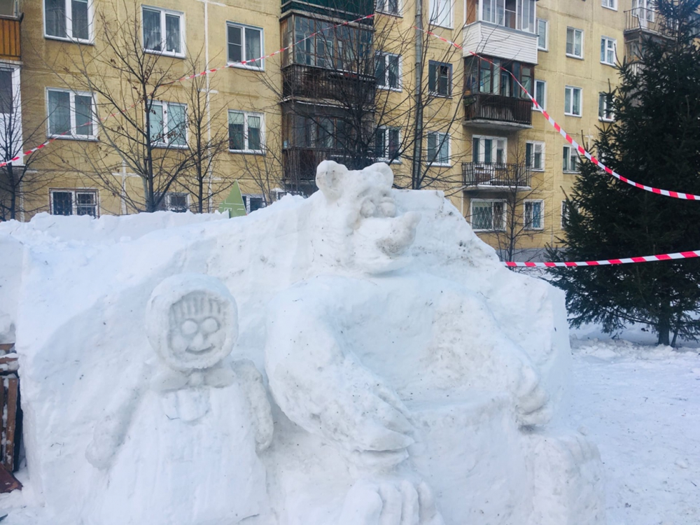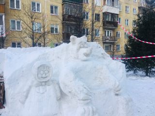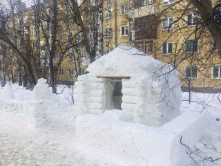 Часть фигур пока только вырезали из снежных кубов, творческий процесс ещё не завершился. Но уже отчётливо видно: вот тут будет самолёт, а там на завалинке Маша и медведь сидят, рядом – сказочная избушка. В неё, кстати, можно залезть. Только аккуратно.