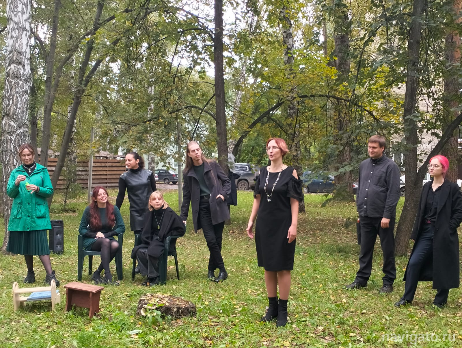 Выступать под открытым небом для актёров «Историй» было довольно сложно. Кроме их главной сцены в ДК им. Чкалова, они обычно дают спектакли в библиотеках, музеях. В помещении, конечно, удобнее выступать. Здесь же было непривычно и немного непонятно, как организовать пространство, взаимодействовать со зрителями. Если актёр говорил тише, его могло быть не слышно из-за шума ветра. Но зрители подошли поближе. Чувствовалось, с каким вниманием они следят за выступлением. И падающие осенние листья, кружась над актёрами, создавали особое романтическое настроение.