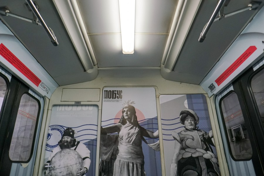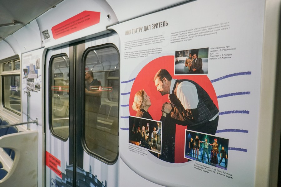 В вагоне – 12 настенных плакатов, расположенных между окнами. Украшены торцевая стена и все 8 дверей – фотографиями зданий театров, спектаклей и театральных деятелей. Также пассажиры могут узнать любопытные факты: к примеру, в спектакле «Робин Гуд» задействована настоящая пивная бочка с резким характерным запахом, а для «Шута Балакирева» бутафоры засолили три сотни «огурцов». Снаружи вагона – логотипы Года театра. Оформление шло целую неделю.