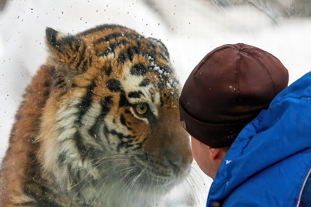 Стеклянная часть ограждения вольеров львов и тигров, сделанная для удобства посетителей, у животных тоже вызывает интерес. Они часто подходят к стеклу, рассматривают людей.