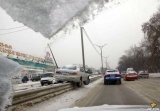 Как рассказали позже в соцсети «ВКонтакте» очевидцы, машина не остановилась на светофоре и, объезжая другой транспорт, с приличной скоростью «пошла на взлет». Возможно, у Тойоты отказали тормоза. Некоторые говорят, что причиной стала колея на дороге.