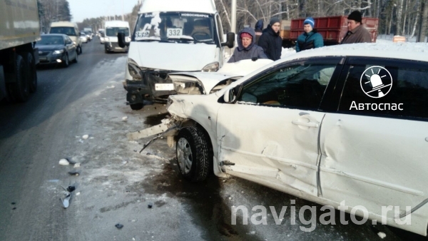 В районе АЗС "Топаз" (Бердское шоссе, 530) Тойоту занесло, она сначала врезалась в маршрутку, потом ее отбросило в снежный вал на разделителе и ударило об столб, отчего развернуло.