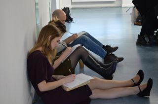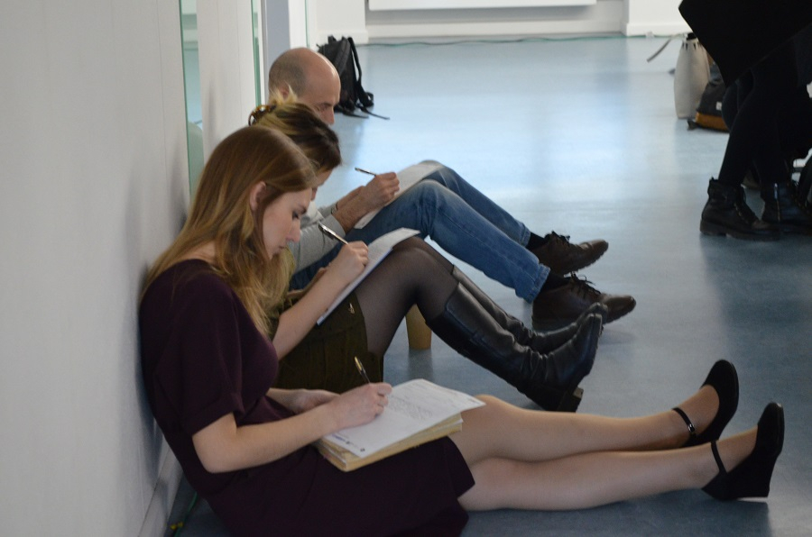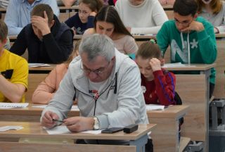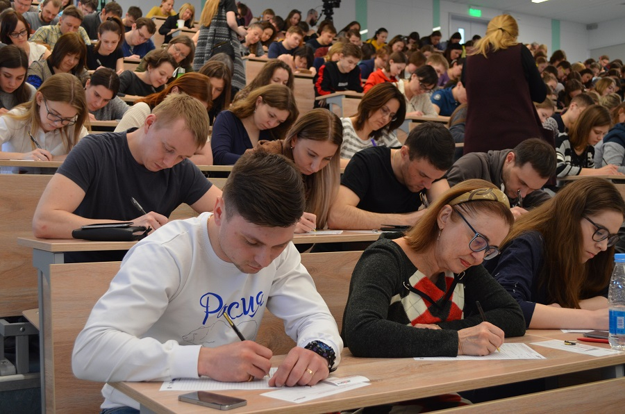 Свободных мест в аудитории нет: пишут за партами, на окнах, сидя в проходах и на полу. Кто-то делит один стул на двоих, смеясь и говоря «в тесноте, но пишем». Взрослые и дети. Всё — в лучших традициях Тотального диктанта.