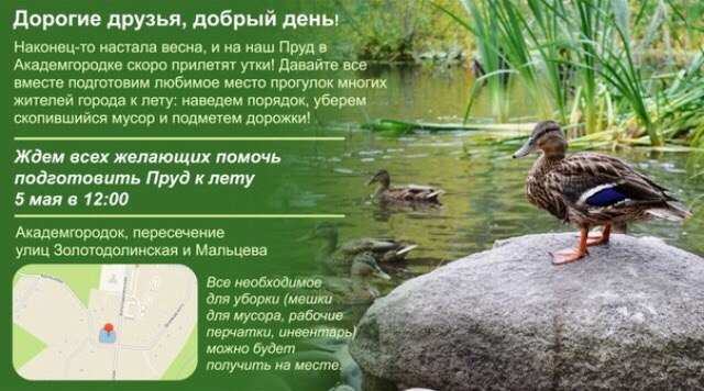 5 мая, в субботу, в 12.00 пройдет традиционный субботник на пруду с утками на пересечении улиц Золотодолинской и Мальцева.