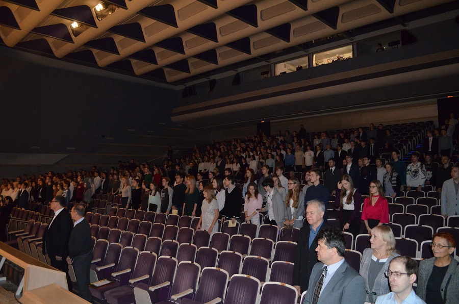 В 10 часов утра в Большом зале Дома ученых собираются ребята из СУНЦ НГУ. Они зачислены в учебное заведение в этом году. Пройти обряд посвящения должны были 300 учащихся. Однако сегодня проходит олимпиада по физике, и часть школьников отправилась туда. Поэтому саму процедуру решили разделить на две части: олимпиадников посвятят в фымышата после обеда.