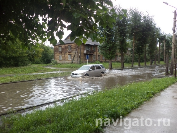 Интенсивный дождь в обед 23 июля превратил проезжую часть в огромную лужу.
