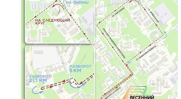 Маршрут полумарафона пройдет по следующей схеме: старт у здания по ул. Николаева, 11 – ул. Николаева – проспект Академика Лаврентьева – проспект Академика Коптюга – Университетский проспект с разворотом на пересечении с ул. Ильича, далее обратно по проспекту Академика Коптюга – ул. Академика Будкера – ул. Инженерная с финишем у здания по ул. Николаева, 11.