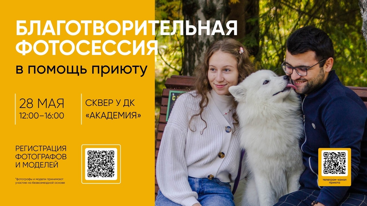 28 мая, в воскресенье, с 12 до 16 часов в сквере у Дома культуры «Академия» пройдет первая весенняя фотосессия в этом году в помощь приюту для бездомных животных в Академгородке.