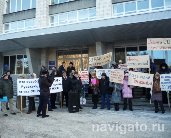 1 декабря у здания Президиума СО РАН состоялся митинг протеста жителей общежитий Сибирского отделения и ряда домов микрорайона Шлюз. Первые требовали провести приватизацию общежитий, вторые – признать решение общего собрания собственников дома № 29 на улице Русской о смене управляющей компании. На акцию протеста пришло, как минимум, 60 человек митингующих. Они ссылались на то, что 22 октября представители СО РАН (академики Сагдеев и Власов, член-корреспонденты Ляхов и Похиленко) на совещании в правительстве Новосибирской области согласились на приватизацию общежитий при условии строительства двух новых зданий, но через два дня это согласие было дезавуировано руководством Сибирского отделения. Кроме того, им непонятна позиция Совета научной молодежи СО РАН, который не поддержал точку зрения нынешних и бывших научных сотрудников, десятки лет проживающих в общежитиях. С их точки зрения руководство Сибирского отделения намеренно сталкивает научную молодежь с жителями общежитий.