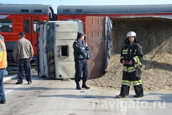 На железнодорожном переезде в Бердске 8 сентября около 11.00 столкнулись электропоезд и КамАЗ с песком.