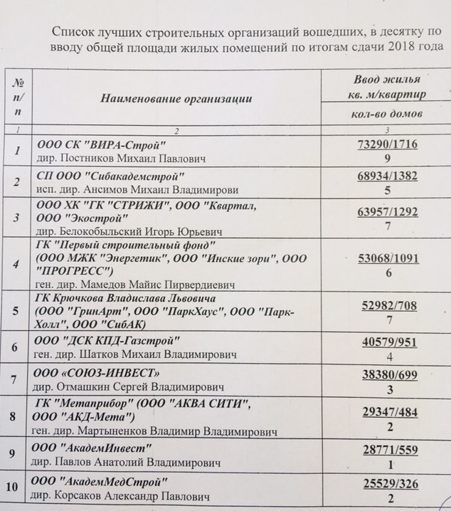Возглавляет список компания «Вира-Строй» (73 290 кв. м, 1716 квартир в девяти домах), на втором месте – СП ООО «Сибакадемстрой» (68 934 кв.м, 1382 квартиры в пяти домах).