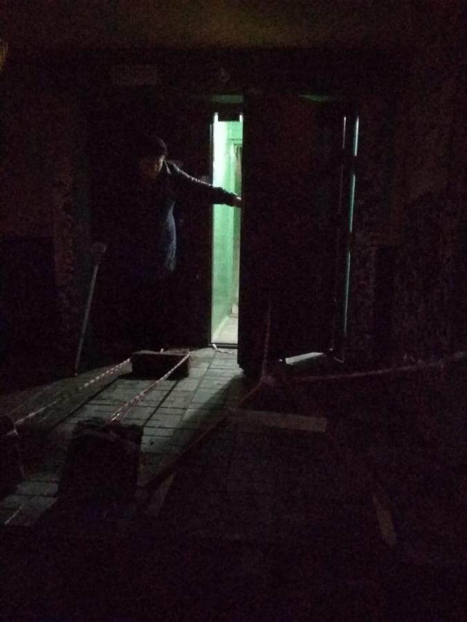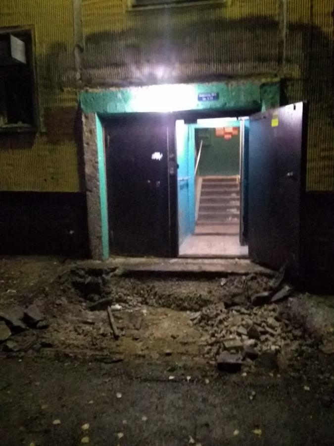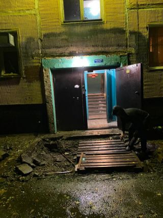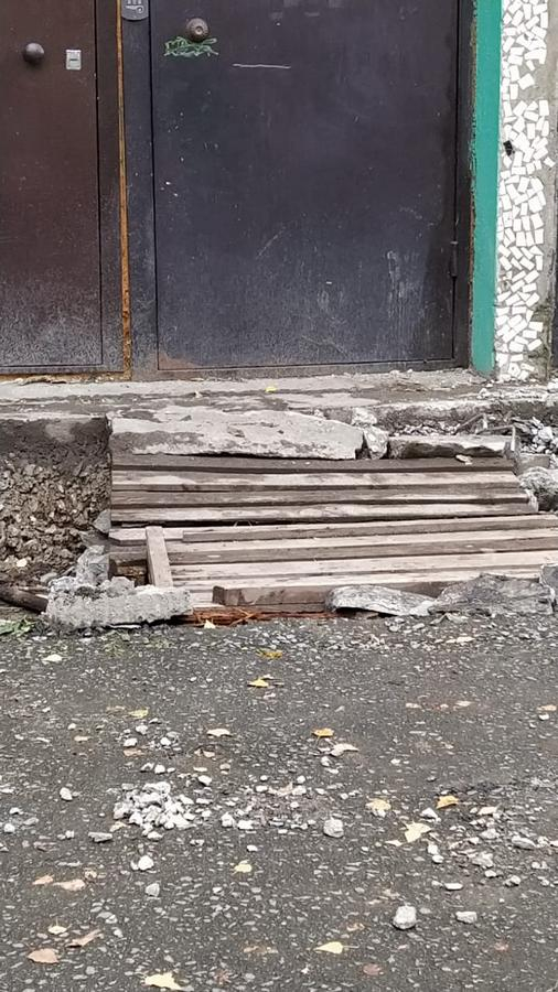 Итоги первого дня ремонта крыльца первого подъезда дома № 15 на улице Иванова можно сравнить с последствиями небольшого локального взрыва. Всего за пару вечерних часов 25 сентября исчез бетонный козырек над крыльцом, а также большая металлическая труба и мозаичная бетонная плита, поддерживавшая навес с обеих сторон. Зато появилась глубокая яма около входной двери.