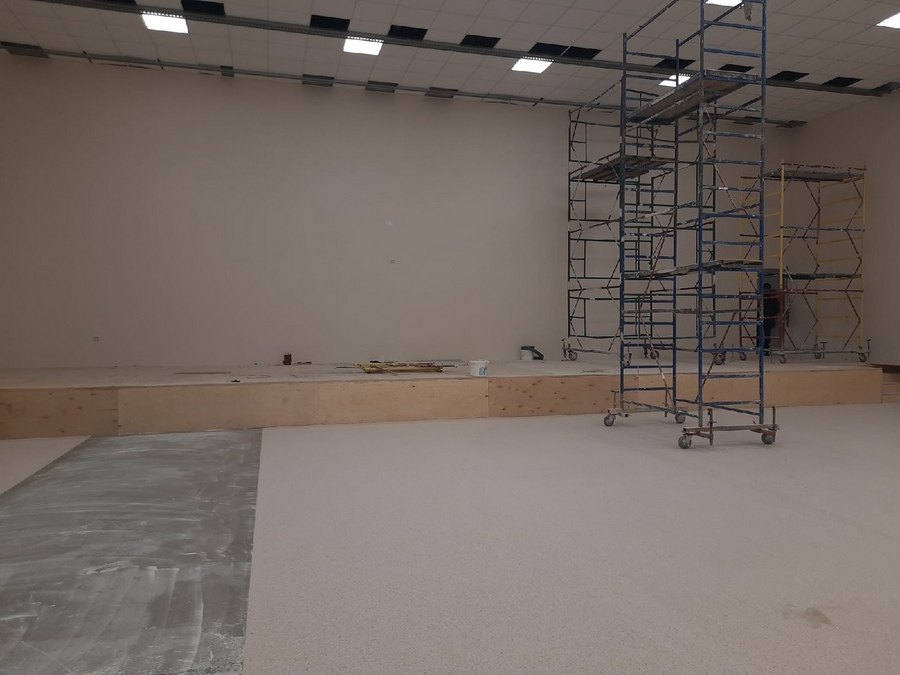 Не понравилось Анатолию Локтю то, что в актовом зале нет уклона поверхности пола: детям с задних рядов не будет видно, что происходит на сцене, и это очень плохо. Строители попытались немного исправить ситуацию, сделали две ступени во второй половине зала, но это ситуацию не спасёт. А изменения в проект внести уже невозможно.