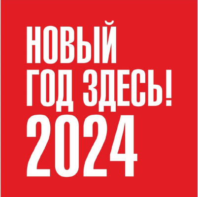 В качестве логотипа предложен красный квадрат с надписью «Новый год здесь! 2024». Возможно и размещение надписи на поле другого цвета. Создан также объёмный вариант на грани куба. Любое из предложений можно использовать в зависимости от задач учреждений культуры и оформителей. По такому же принципу можно создавать логотипы своих мероприятий. Рекомендуется выбирать контрастные сочетания цветов.