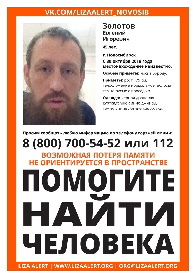 Помощи в поисках 45-летнего Евгения Золотова просят волонтеры из поискового отряда «Лиза Алерт Новосибирск».