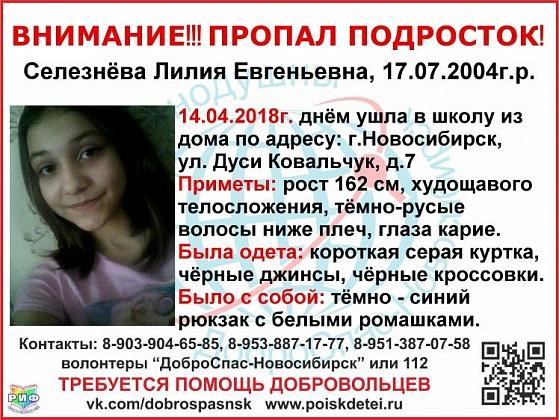Девочка пропала в субботу, 14 апреля. Ушла в школу и больше ее никто не видел, сообщают волонтеры «ДоброСпас-Новосибирск» в соцсети «ВКонтакте».