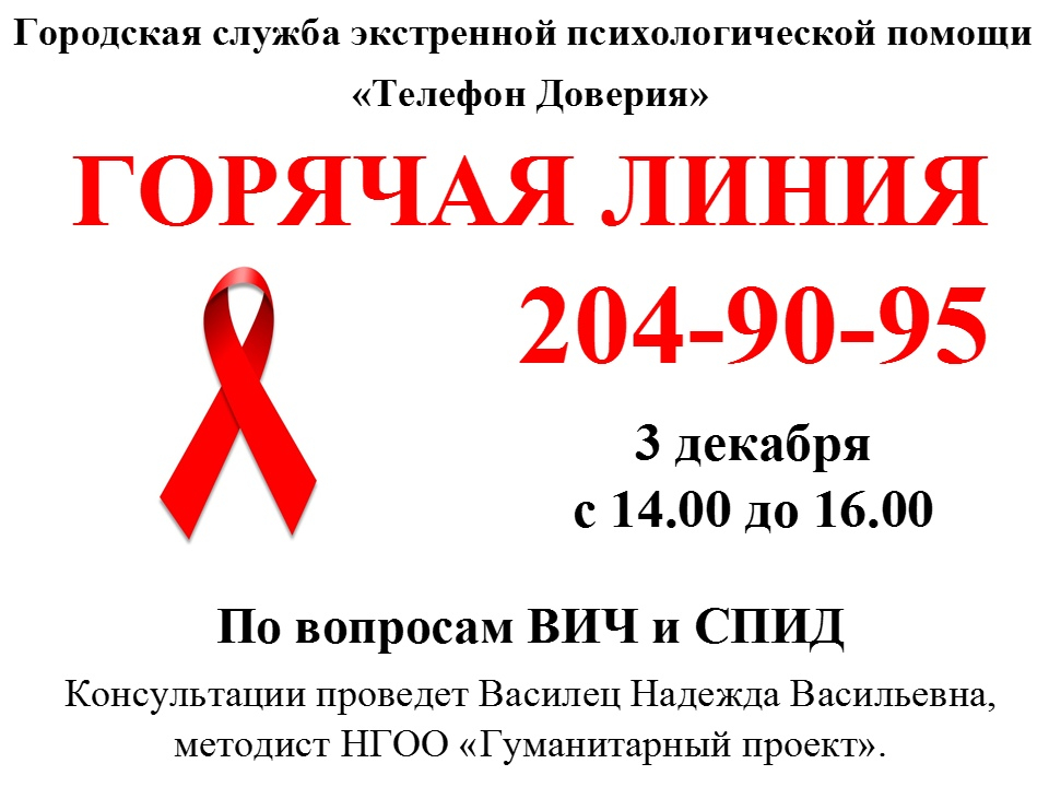 3 декабря для всех жителей города Новосибирска Надежда Василец, методист НГОО «Гуманитарный проект», совместно с городской службой экстренной психологической помощи «Телефон Доверия» проведут горячую линию по вопросам ВИЧ и СПИД.