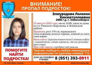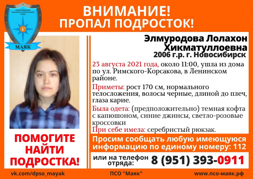 Поисковый отряд «Маяк» просит помощи в распространении информации о пропавшей Лолахон Хикматуллоевне Элмуродовой 2006 года рождения.