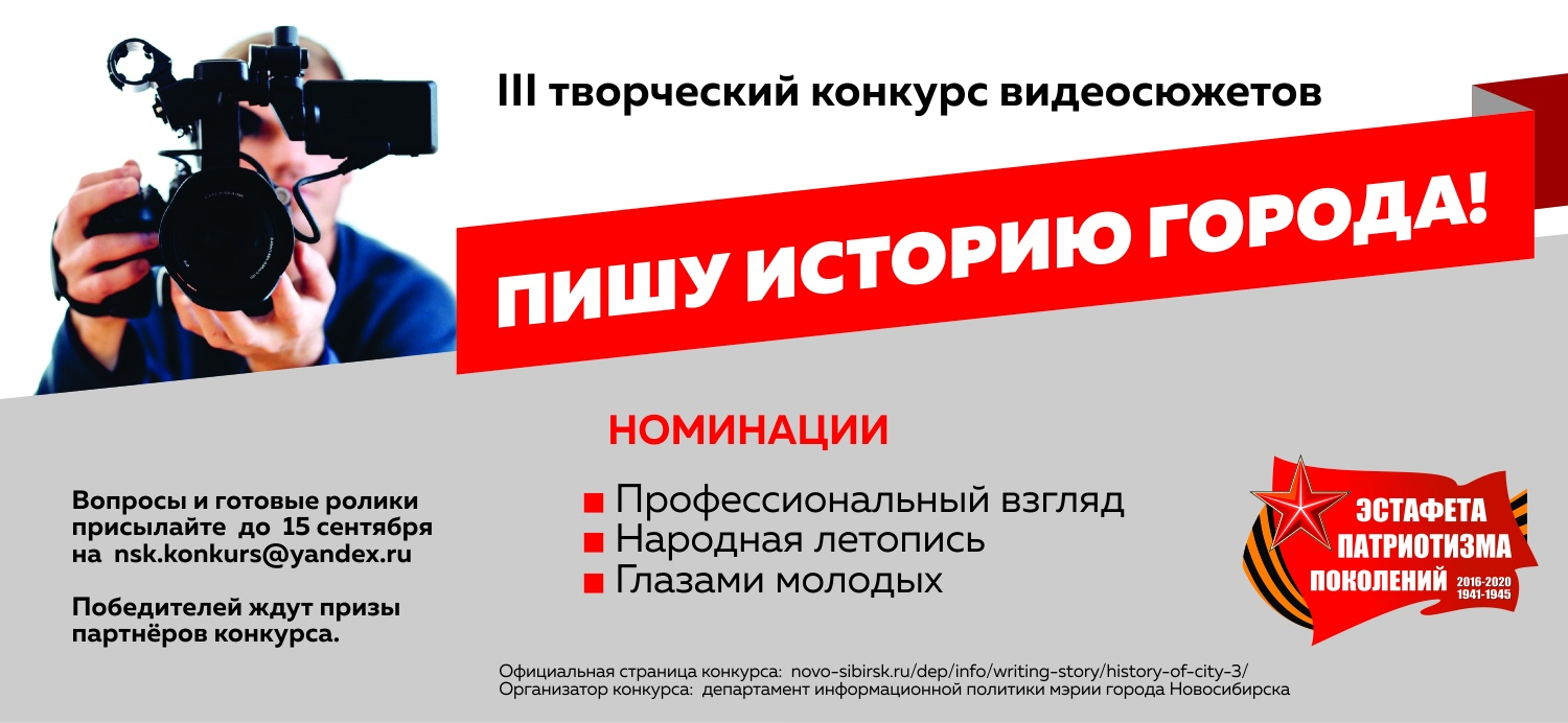 С 1 мая стартует прием заявок и работ на III творческий конкурс видеосюжетов «Пишу историю города» – кинолетопись свершений в Новосибирске по годам проведения «Эстафеты патриотизма поколений».
