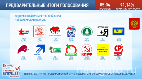 По результатам обработки 91,63 % бюллетеней в Новосибирской области партия «Единая Россия» набирает 38,38 % голосов, КПРФ — 19,69 %, ЛДПР — 19,36 %, «Справедливая Россия» — 5,58 %.