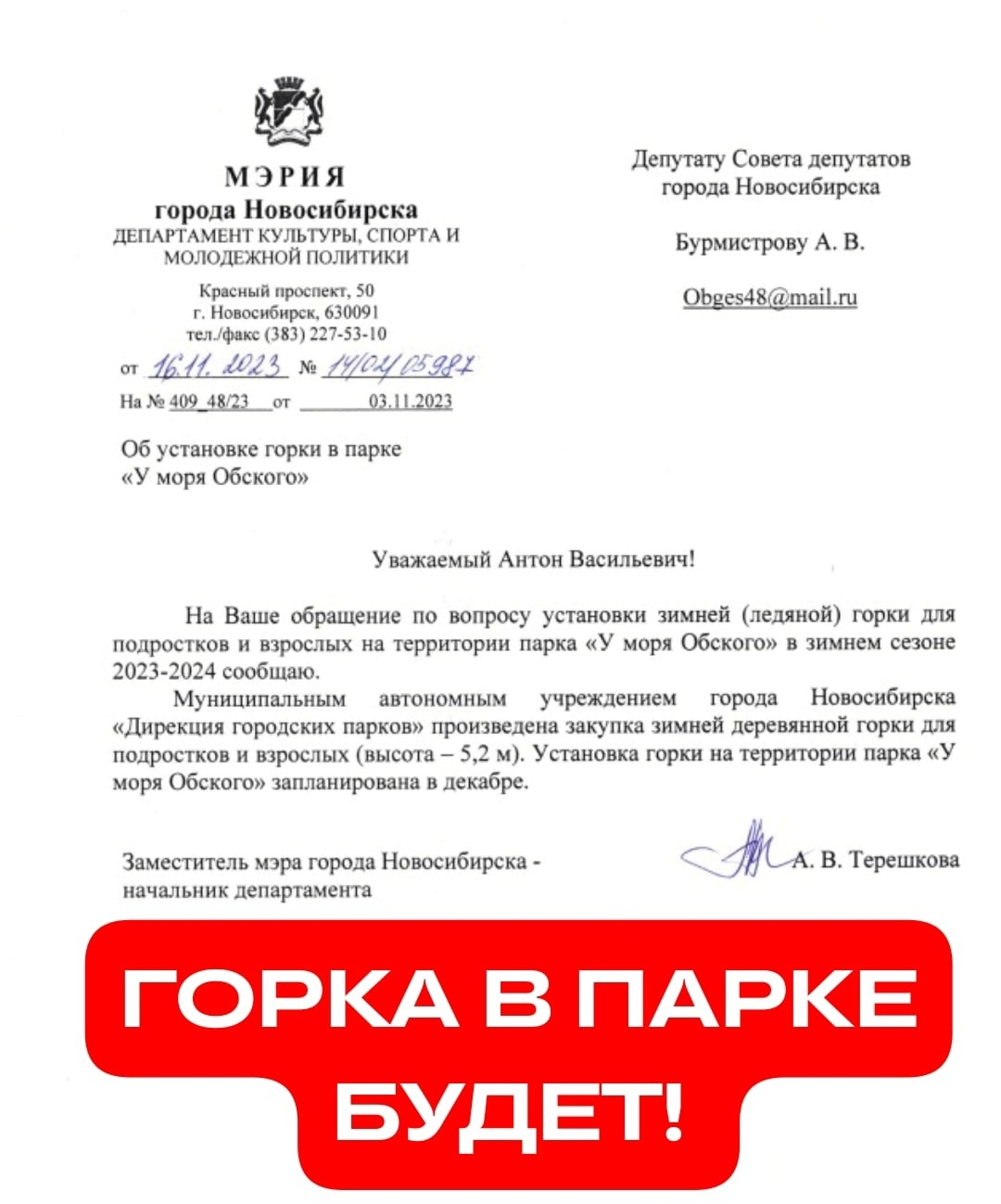 Пришёл ответ, подтверждающий информацию об установке полноценной горки в нашем парке для взрослых и подростков в наступающем зимнем сезоне. Благодарю Департамент по культуре, спорту и молодежной политике мэрии Новосибирска и специалистов за такую отличную новость для жителей ОбьГЭСа и гостей парка. Уже в декабре начнут её установку, — написал Антон Бурмистров у себя на страничке.