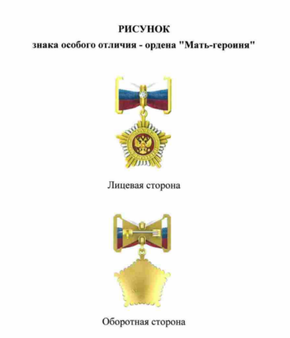 Женщине также будет вручен знак особого отличия — орден «Мать-героиня». Он должен носиться на левой стороне груди выше других госнаград. Сам знак сделан из золота с бриллиантом и эмалью. Выглядит он как пятилучевая звезда (лучи в виде золотых и родированных штралов).