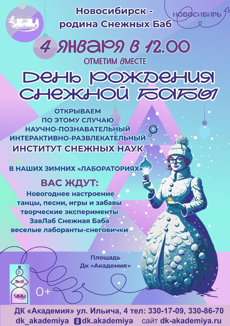 В 12 часов на площади перед ДК «Академия» (ул. Ильича, 4) по случаю дня рождения Снежной бабы откроют научно-познавательный интерактивно-развлекательный ИНСТИТУТ СНЕЖНЫХ НАУК «НИИ снегографии». В зимних лабораториях гостей ждет ЗавЛаб, доктор снежных наук – Снежная баба.