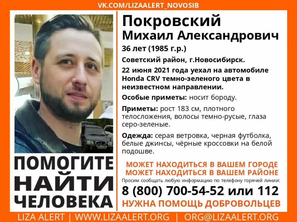 Известно, что 22 июня 2021 года мужчина уехал на автомобиле Honda CRV тёмно-зелёного цвета в неизвестном направлении, – сообщили в поисковом отряде.