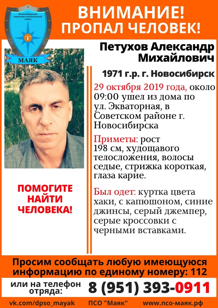 Поисковый отряд «Маяк» просит помощи в розыске и распространении информации о пропавшем Александре Петухове, 1971 г.р.