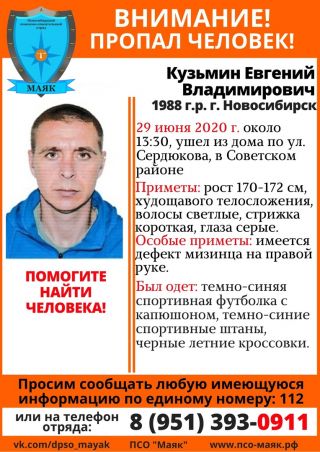 29 июня пропал 32-летний Евгений Кузьмин. Примерно в 13.30 он ушел из дома по улице Сердюкова в микрорайоне ОбьГЭС и до настоящего момента его местонахождение не установлено.