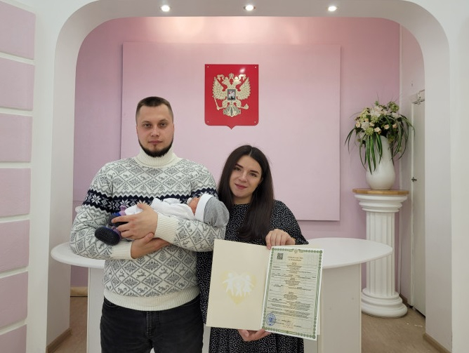 Фото с zags.nso.ru (на снимке Арсений и его родители в день получения свидетельства о рождении 3 октября 2022 г.)